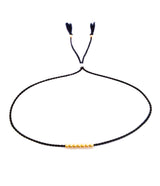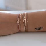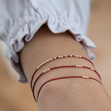 Tiny solid 14k gold beads are carefully mounted on a delicate twisted silk cord. A bead in the middle holds the cords together and cute tassels with 14k gold beads finish the bracelet off.
