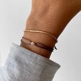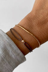 Our tube bracelet is seen here with our https://www.vivienfrank.com/collections/new-in/products/diamond-solitaire-adjustable-silk-bracelet-red-1