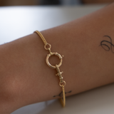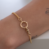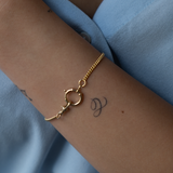 A classic and stunning Watch chain bracelet in solid 14k gold. A bolt clasp is attached to one end of the curb chain and a dog swivel clasp on the other end giving this bracelet a unique look. If you woul like to add any charms to this lovely piece you can insert them in the bolt clasp.
