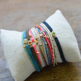 These beautiful charm bracelets are made to be treasured. A perfect white diamond is bezeled in 14k solid gold and then hand braided with a water resistant nylon cord. Your perfect summer bracelet. Wear then stacked, or alone. They make great afordable fine jewelry gifts. Your bracelet will be sent to you in our black Vivien Frank gift box.