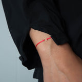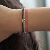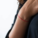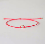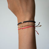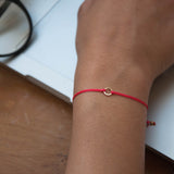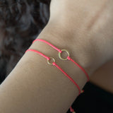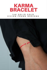 This dainty Karma bracelet is made with a 14k solid gold ring which has been gently hammered and tied with an adjustable sliding knot. Two solid gold faceted beads finish off the ends. A tiny summer treasure!