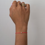 A 0.06ctw or the larger 0.10ctw white diamond is bezeled in 14k solid gold and then braided on a durable nylon cord which is adjustable for a perfect fit. We love them!