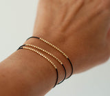 A fun and delicate solid gold disco ball friendship bracelet made with 20 facetted round 14k yellow gold beads carefully strung on silk cord and completed with an adjustable bead in the back and two cute tassels at the ends.