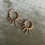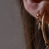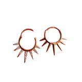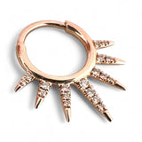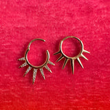 These fun 14k gold spike hoop earrings are studded with white diamonds and are either made for the left or right lob. The backside of the hoop is plain without diamonds.