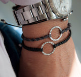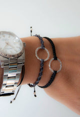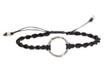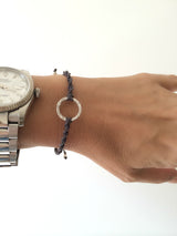 A solid 14k white gold ring is hammered for tecture and then woven with a twist using a beautiful waxed cord which is water resistant and has a subtle eggplant color. The bracelet is adjustable and will fit most wrist sizes.