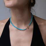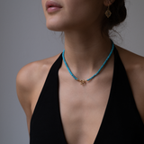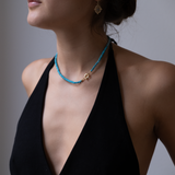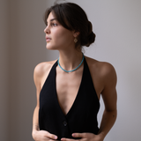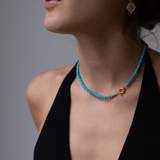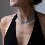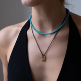 4mm stunning Kingman turquoise is strung on a silk cord. The necklace is finished off with a sailors clasp which is ideal for adding optional charms. Looks stunning on it's own or layered up. Your everyday Turquoise necklace.