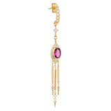 Elevate your everyday elegance with these exquisite pink tourmaline and diamond fringe earrings by Celine Daoust, meticulously handcrafted. Each piece showcases a luminous oval pink tourmaline set in 14K solid gold, delicately framed by sparkling white diamonds that dance with light. Graceful gold fringe drops create a sophisticated bohemian aesthetic, capturing movement with every wear. Measuring approximately 5.6cm, these statement earrings blend artisanal craftsmanship with timeless luxury—a signature expression of refined taste. Available as a pair or single earring. Hallmarked 585 gold; diamond weight approximately 0.022ctw.
