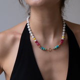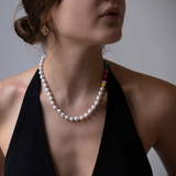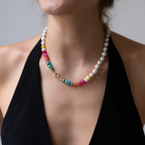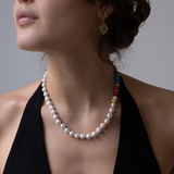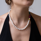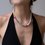 A versatile necklace that can be worn with the clasp in the front exposing the fun and colorful gemstones or the clasp in the back for a more classic pearl look. We love this necklace!