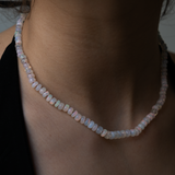 This beautiful ethiopian opal gemstone necklace with suble hues of pastel colors is hand knotted with silk cord and finished off with a gold sailors clasp. Great layering necklace or perfect on its own as well. The model in this image is wearing a 16 inch necklace.