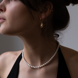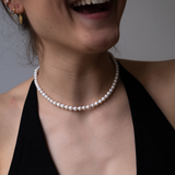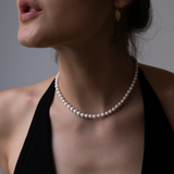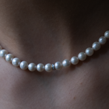 This necklace contains unknotted silk-strung pearls and a 14k gold diamond accent bead. With a striking luster, these natural freshwater pearls measure about 5.5mm and have an AA quality rating, indicating minor imperfections. The most noteworthy aspect of these pearls is their captivating luster.