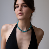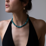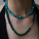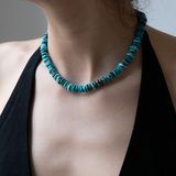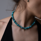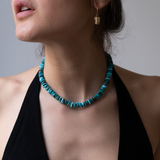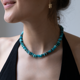 Crafted from authentic Kingman Arizona Turquoise, this necklace features hand-polished 8-9mm discs that are carefully hand-knotted on a luxurious silk cord. With a timeless sailors clasp, this stunning piece can be worn as a stand-alone statement or layered with other pieces, making it the perfect addition to your summer wardrobe.