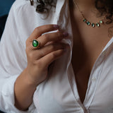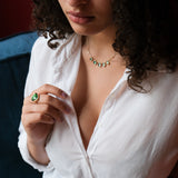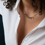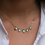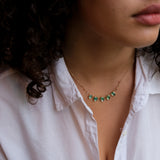 Handcrafted by Celine Daoust this beautiful necklace is set with five hand selected green tourmaline gemstones and six rose cut champagne diamonds. The stones are choosen for their healing properties and energy. The small inclusions in the stones tells a story or the stones journey and makes it all the more unqiue and special.