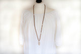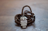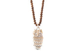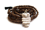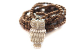 An extra long rosewood necklace featuring a wise owl, and adorned with three sterling silver flower beads.