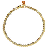 This bracelet is through and through made with 14k solid gold. The beads are Diamond bar cut and measure 3mm. The beads are strung on a 14k gold cable chain and mounted on a 14k gold lobster clasp. All our bracelets are hallmarked with 585 VFD ( 14k gold). This bracelet is perfect to keep on and will not tarnish in any way, a great everyday stacking bracelet.