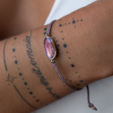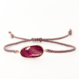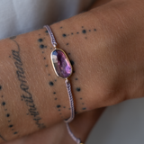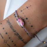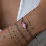 14k solid gold braided Tourmaline bracelet. This natural tourmaline is pink in color with a hint of lilac. It is a rose cut tourmaline and it has been bezeled in 14k solid gold. On the back of the charm you will find the gold hallmarks. Bringing friendship bracelets to an elevated level. Watch the light reflect in this lovely stone