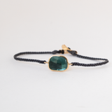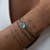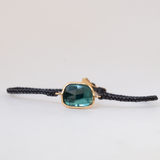 14k solid gold braided Tourmaline bracelet. This natural tourmaline is blule in color. It is a rose cut tourmaline and it has been bezeled in 14k solid gold. On the back of the charm you will find the gold hallmarks. Bringing friendship bracelets to an elevated level. The light reflects beautifuly in this stone.