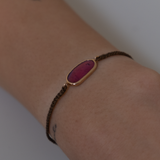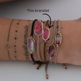 14k solid gold braided Tourmaline bracelet. This natural tourmaline is pink in color with a hint of lilac. It is a rose cut tourmaline and it has been bezeled in 14k solid gold. On the back of the charm you will find the gold hallmarks. Bringing friendship bracelets to an elevated level. Watch the light reflect in this lovely stone