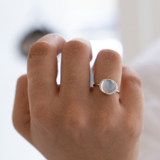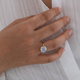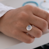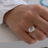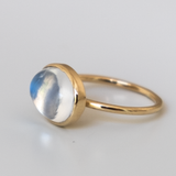 Expertly set in 14k Solid Gold with a bezel finish, this unique moonstone ring boasts a stunning play of transparent, blue, and white light. Handcrafted from start to finish, this minimalistic jewelry piece is truly one-of-a-kind.