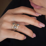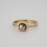 A natural black rose cut diamond with specs of white and dark brown inclusions, has been hand bezeled with a unique milgrain technique delicately setting this wonderful diamond.