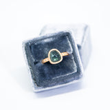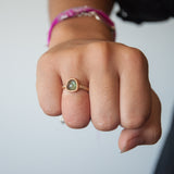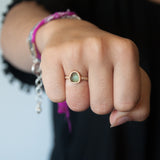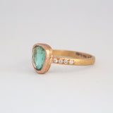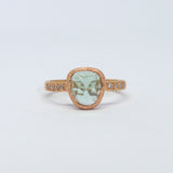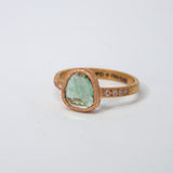 The Stella Ring features a natural rose cut green tourmaline gemstone, set in a pale 14k rose gold and embellished with 8 white diamonds. A handcrafted one-of-a-kind heirloom ring.