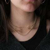 Our gold beaded necklace is super lightweight and great for layering, it is made with 2.5mm or 3mm round beads either in 10k or 14k solid gold which are strung on a silk cord for a perfect movement.