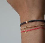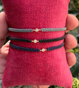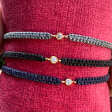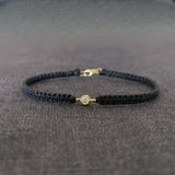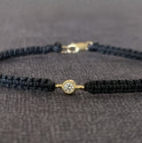 A genuine white diamond is bezel set in 14k gold and handcrafted with a water resistant nylon cord. The bracelet is made to be loved and kept on.