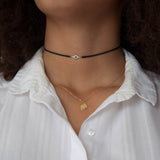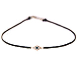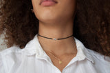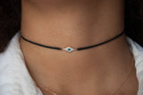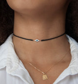 Stunning blue and white diamonds are set in solid 14k gold and hand braided with black nylon cord into an adjustable choker necklace. Great piece to wear on its own or layered with longer necklaces. We love!