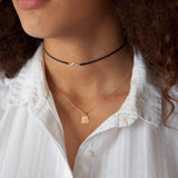 Tag necklace aslo in this image can be found here https://www.vivienfrank.com/collections/new-in/products/dainty-initial-necklace-tags-in-solid-gold