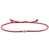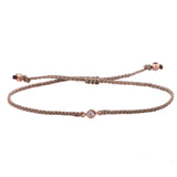A 0.06ctw or the larger 0.10ctw white diamond is bezeled in 14k solid gold and then braided on a durable nylon cord which is adjustable for a perfect fit. We love them!