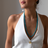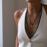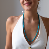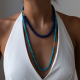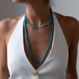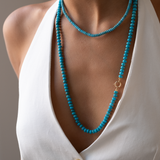 A long turquoise necklace with 6mm rondelle beads is hand knotted on a silk cord.  The necklace is finished off with a 14k solid gold clasp which is ideal for adding optional charms. Looks stunning on it's own or layered up.