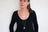 A beautifully hand crafted OM symbol pendant made with solid sterling silver and slightly oxidized in an earthy brown tone hangs from a long ball chain Necklace.